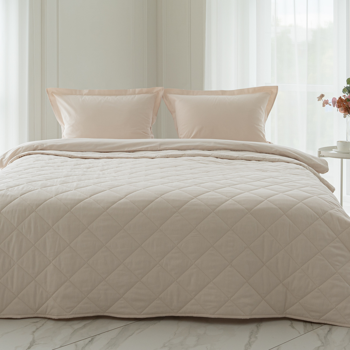 - хлопковое покрывало на кровать с закругленным уголком, практичной окантовкой по периметру изделия и стильной стежкой в виде ромбов;