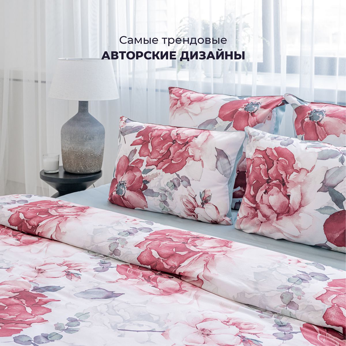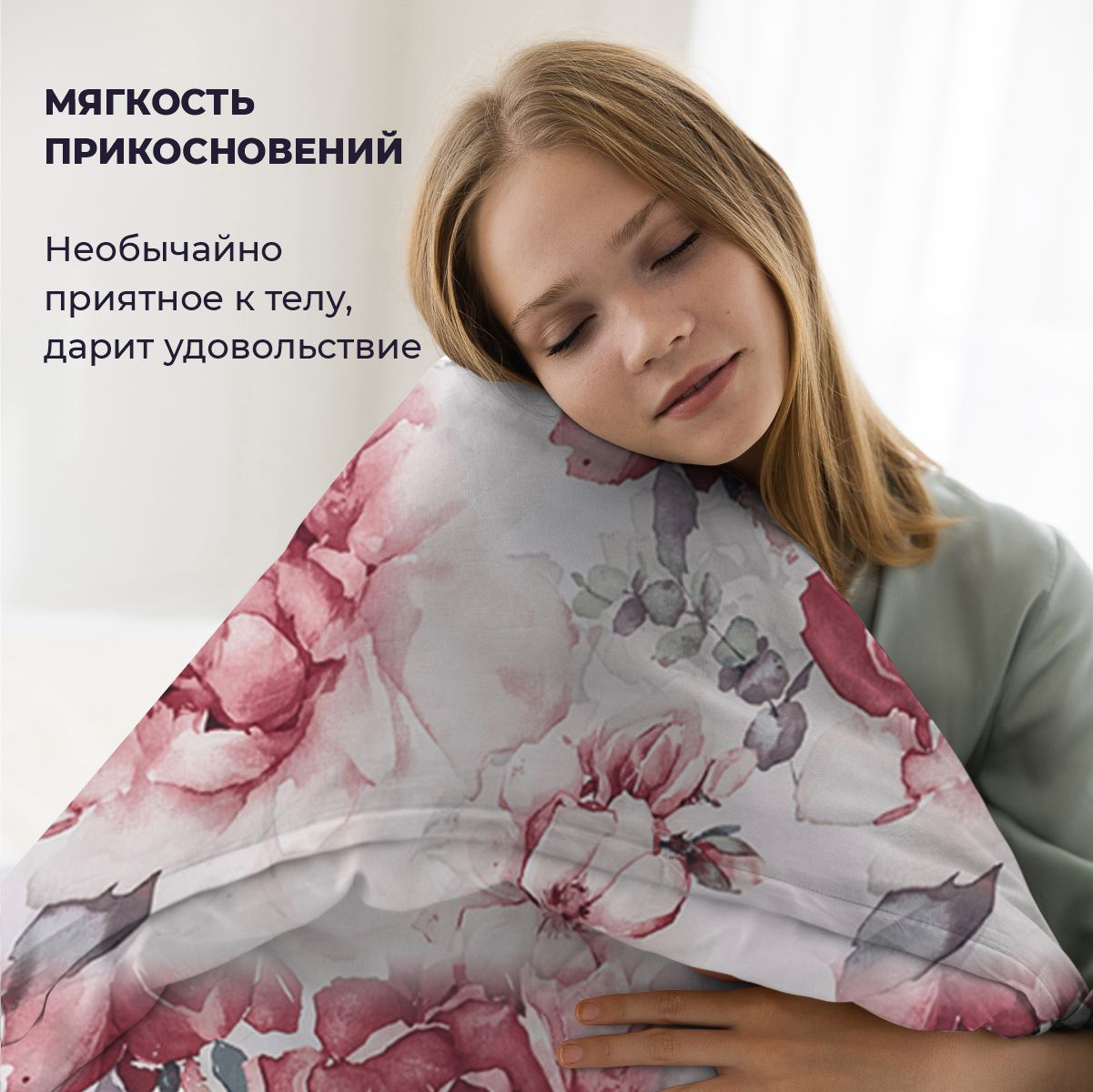 Эффектный акварельный принт, созданных искусным художником. Яркая и сочная красота крупных бутонов чарует и манит… Изящество и нежную красоту роскошного дизайна подчеркивает нежный белоснежный фон комплекта.