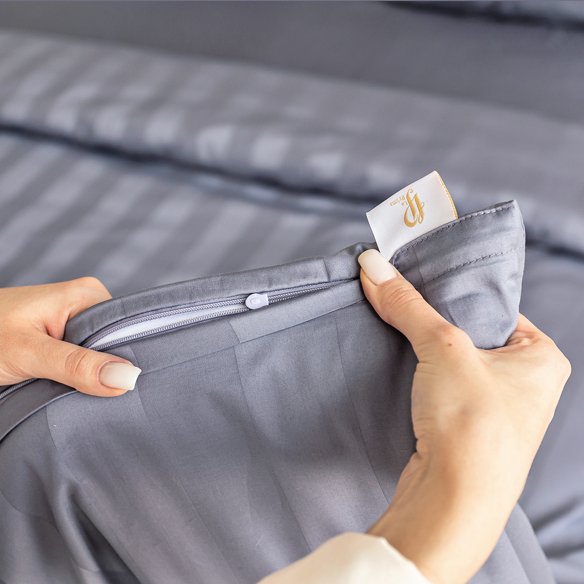 - «Невидимая» молния во всю ширину по нижнему краю пододеяльника. Для быстрой и удобной смены постельного белья в верхней части пододеяльника расположены клапаны для рук. Сменить пододеяльник можно за 30 секунд.