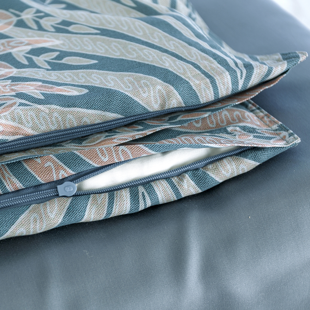 - 4 наволочки в комплекте:50х70см - декоративные ушки 4 см с двойной отделочной отсрочкой по трем сторонам наволочки. «Невидимая» молния по широкой стороне наволочки. 70х70см - двойная отделочная отстрочка по трем сторонам наволочки. «Невидимая» молния по нижнему краю наволочки.