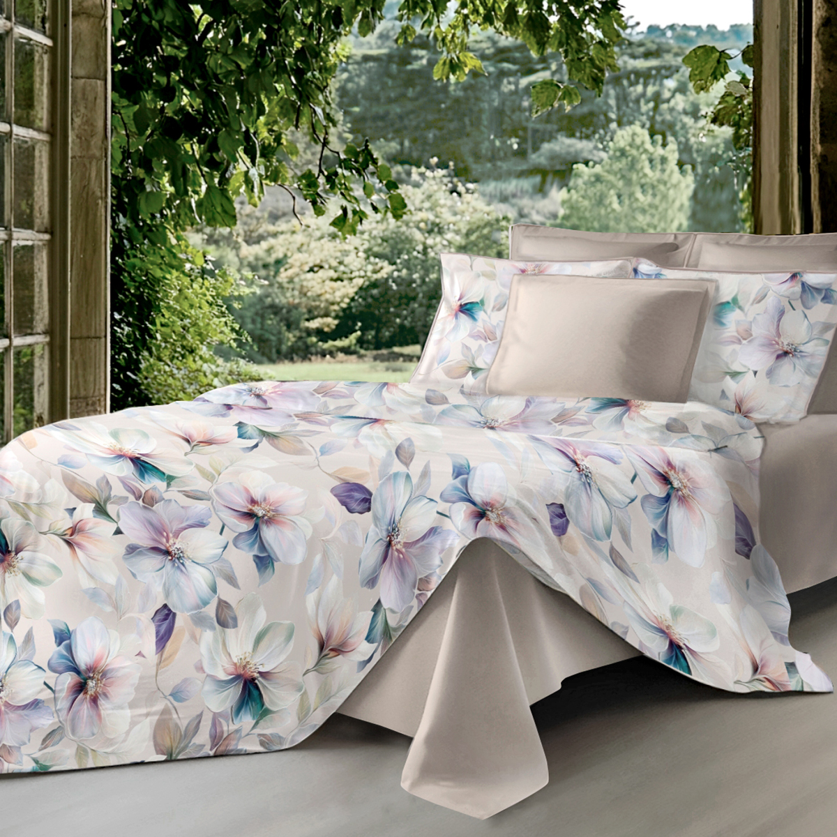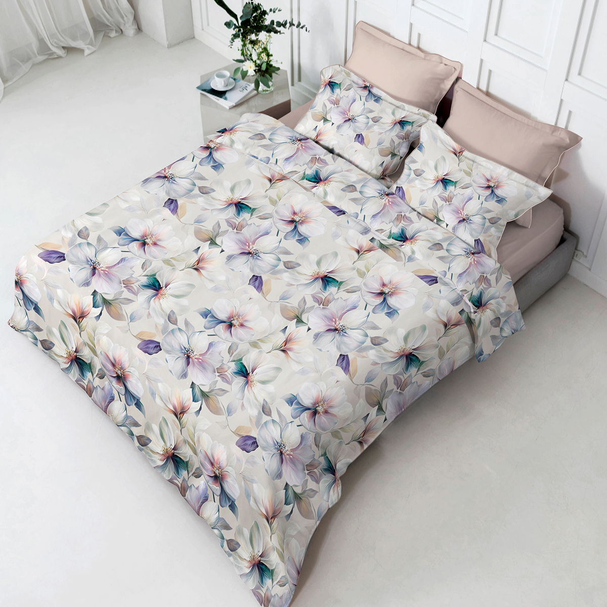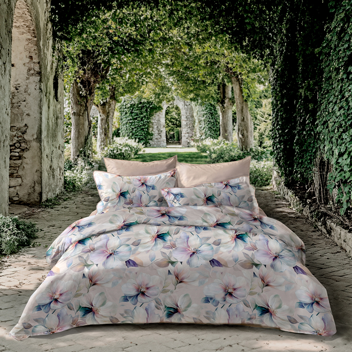 Фьорелла. Постельное бельё с принтом из крупных нежных цветов словно окутывает спальню атмосферой весеннего сада, где каждый лепесток дышит мягкой элегантностью. Роскошные бутоны, будто написанные акварелью, раскинулись по ткани в свободном, но гармоничном танце, где сон становится похож на погружение в живую картину.
