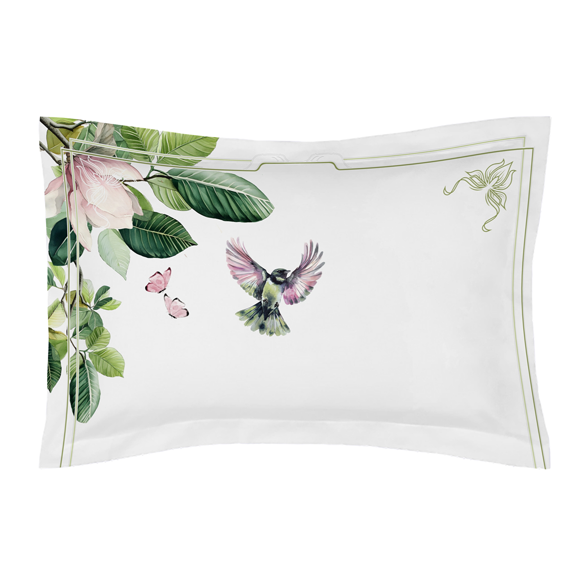 Как живописное полотно в зелёной раме: сочные листья обрамляют спальное место, будто музейный багет. А райские птички и бабочки – будто ожившие персонажи картины, которые решили поселиться в вашей личной галерее сна вот-вот вспорхнут с подушки.