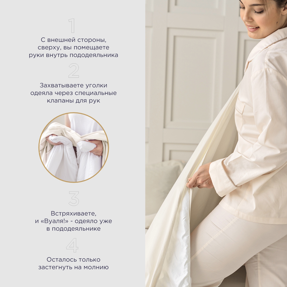 - Встряхиваете одеяло и улыбаетесь, ведь оно уже в пододеяльнике!