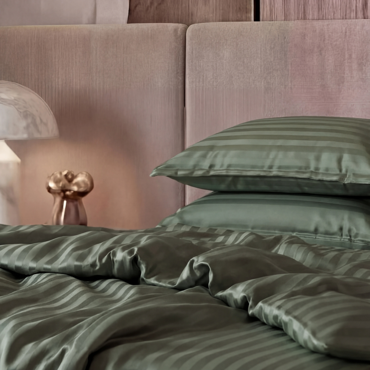 Постельное белье в трендовых оттенках 2025 года, делает спальню похожей на фото из интерьеров топовых дизайнеров.