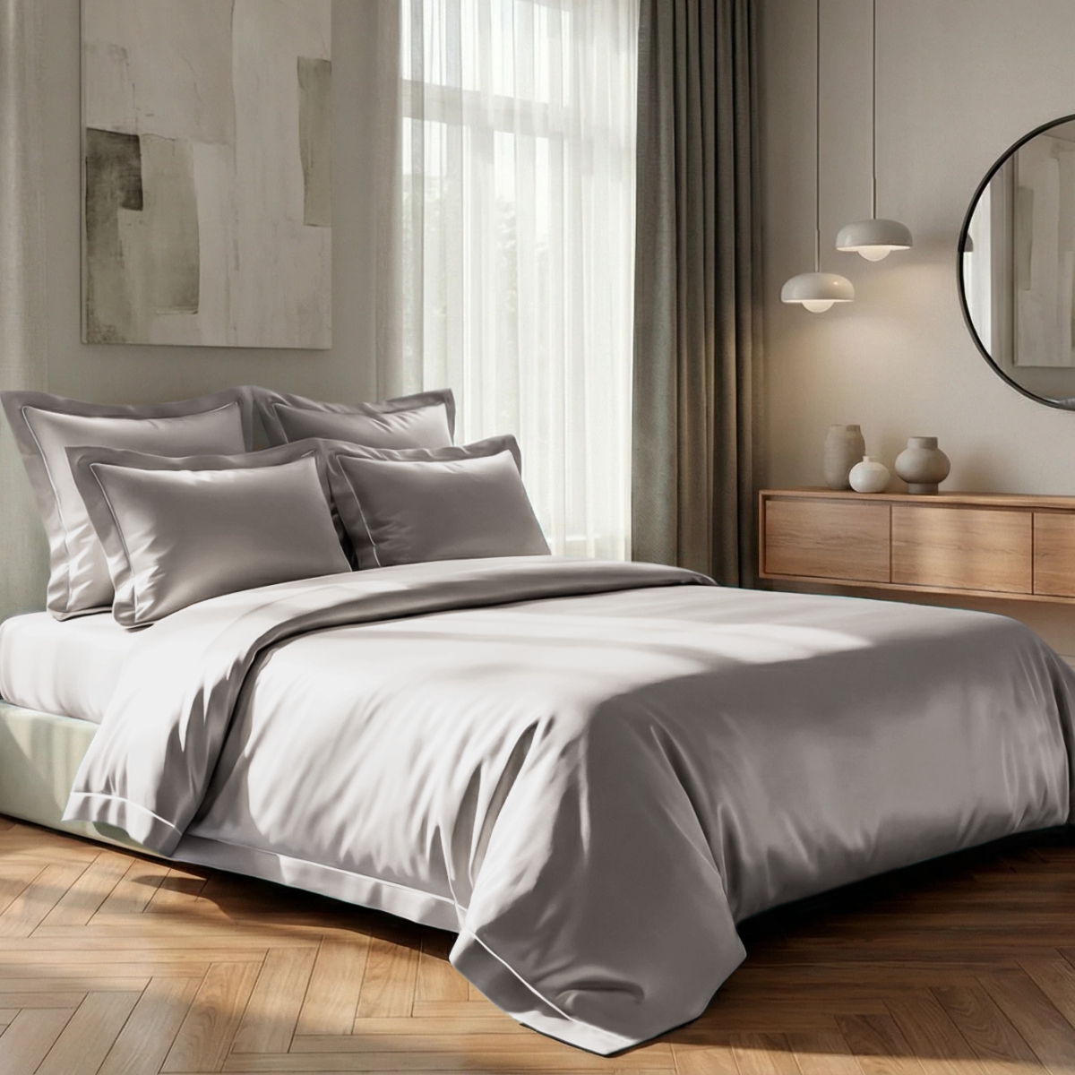 - Эстетика премиум-класса: благородные цвета и утончённый дизайн мгновенно преображают пространство спальни, добавляя ему современности и изысканности.